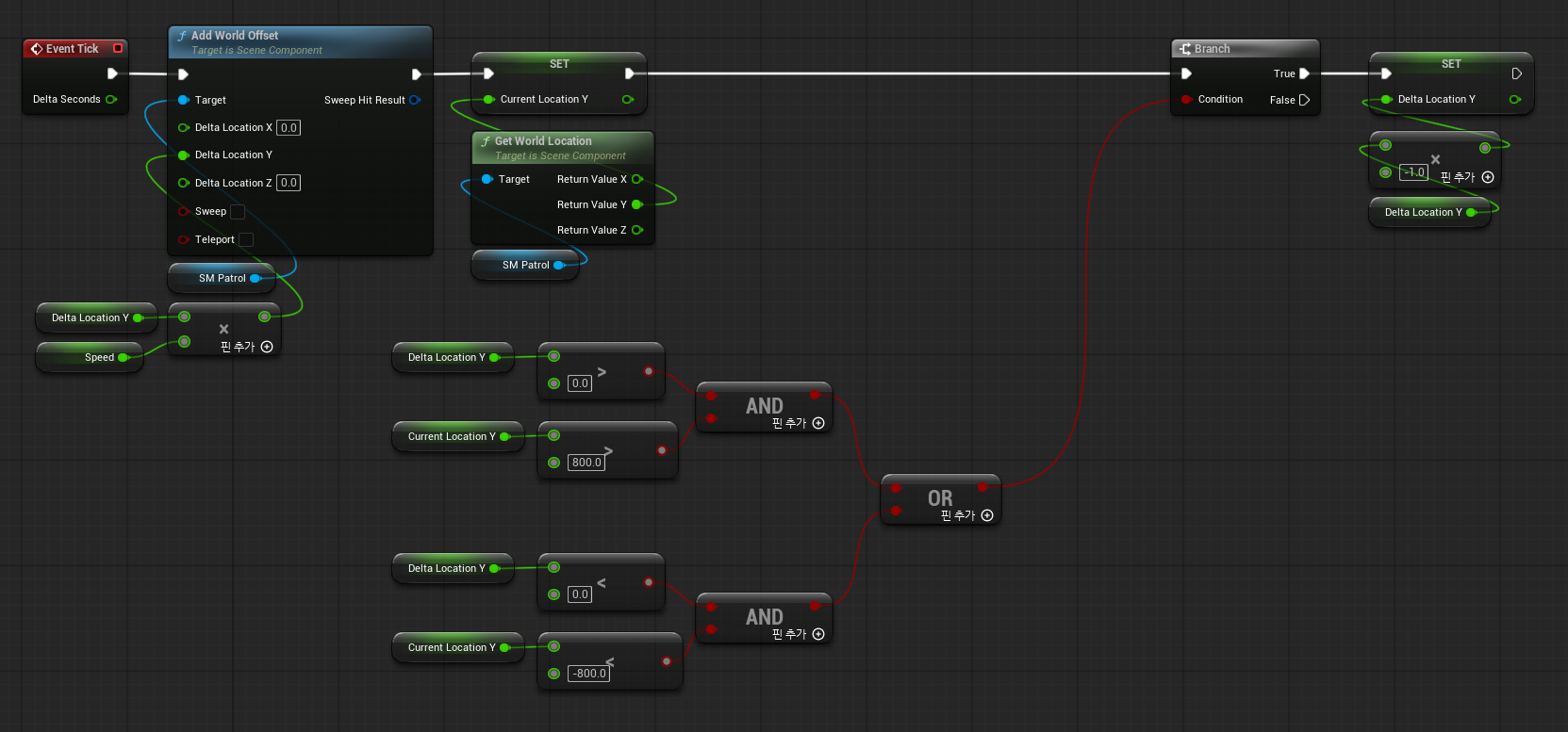 - BP_Patrol에 사용한 StaticMesh를 모델링 모드에서 생성하면서 콜리전 옵션을 지정하지 않아 TriggerBox의 콜리전이 작동되지 않았다. 어트리뷰트 > 메시 콜리전을 적용하여 정상적으로 닿았을 때 Trigger가 적용되게 수정되었다.